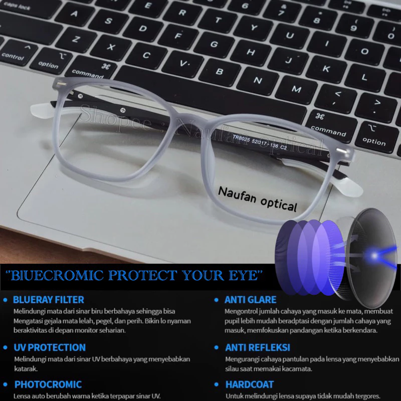 Keunggulan Bluecromic Pro ini nggak main-main, lho. Perubahan warnanya jauh lebih cepat dari kacamata biasa dan hitamnya lebih pekat. Selain itu, sudah ada lapisan Scratch Resistant yang bikin lensa kamu nggak gampang tergores meski sering dibawa-bawa.